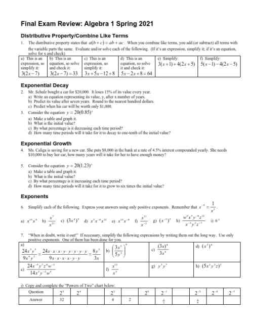 Algebra 1 Final Exam Help Review Packet Homework Help